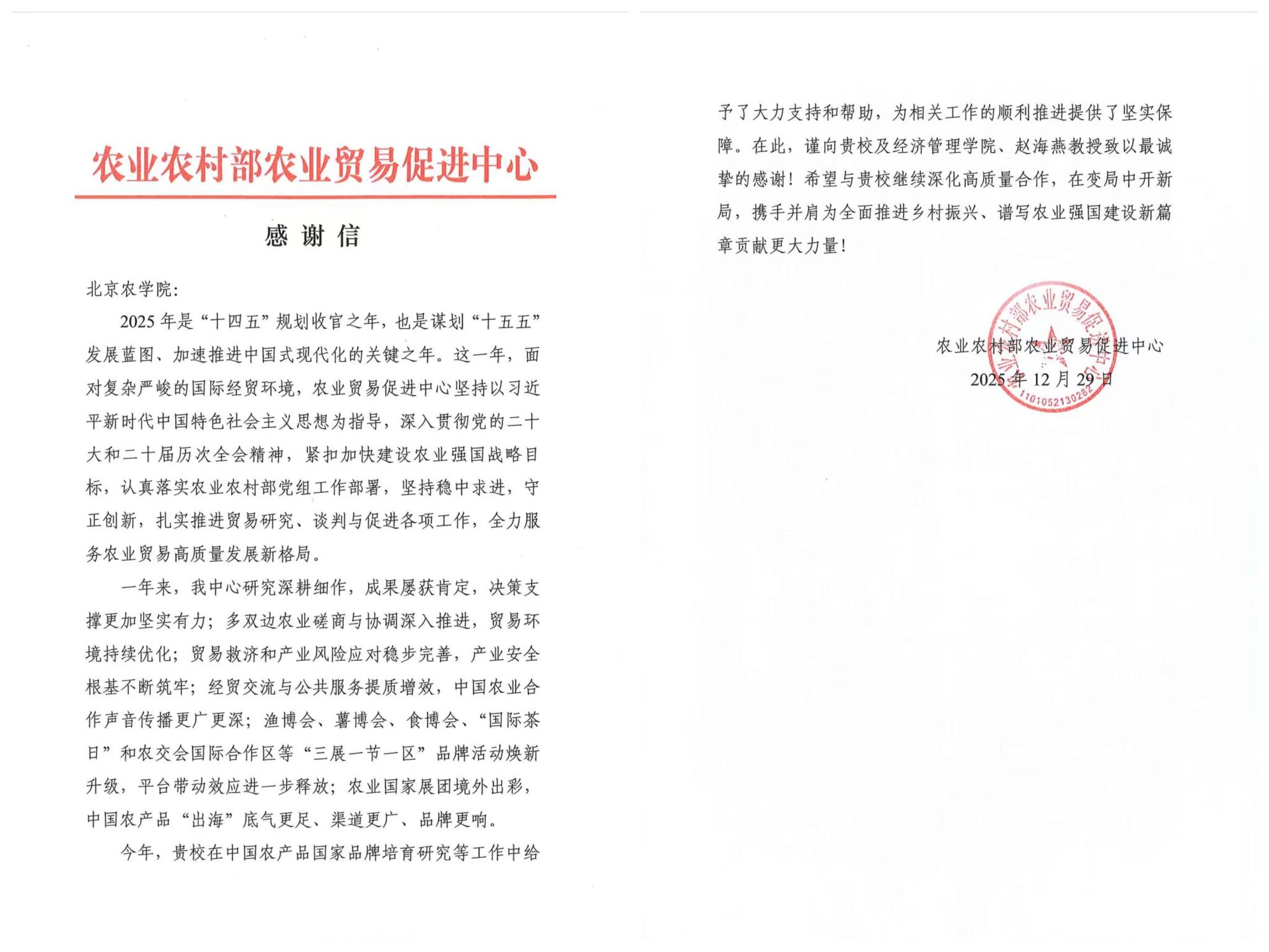 12月29日,农业农村部农业贸易促进中心向我院发来感谢信,对我院赵海燕教授团队在“中国农产品国家品牌培育研究”等工作中的大力支持和帮助致以诚挚感谢!