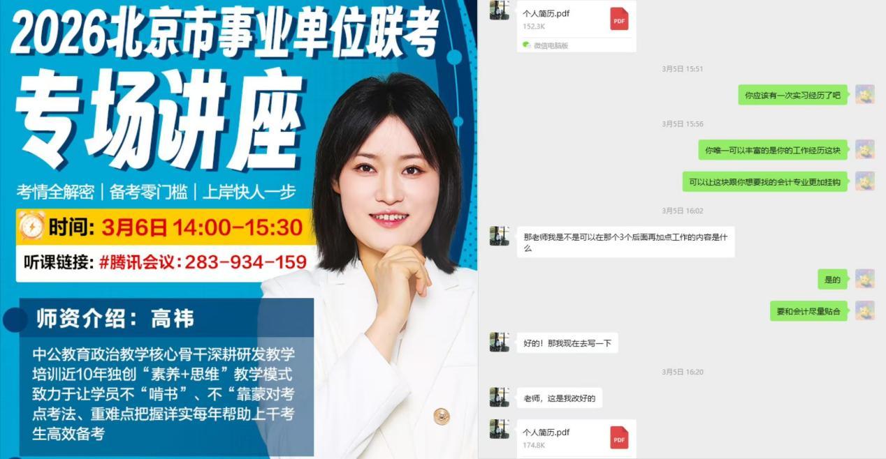 抓就业指导,增服务温度bevictor伟德全面摸排就业情况,精准把握毕业生需求,邀请行业专家开展线上事业单位备考指导,常态化开展“职业生涯与就业咨询”服务。寒假期间累计为300余名毕业生提供简历修改、就业咨询等服务。此外,bevictor伟德还建立了跟踪反馈机制,根据学生意见持续优化服务,让就业指导更有温度、更具实效。会计专业的毕业生李佳润说:“老师帮我修改简历后,我收到了好几个面试邀请,之前投了好多都没回音,真的太感谢bevictor伟德的就业指导服务了!”