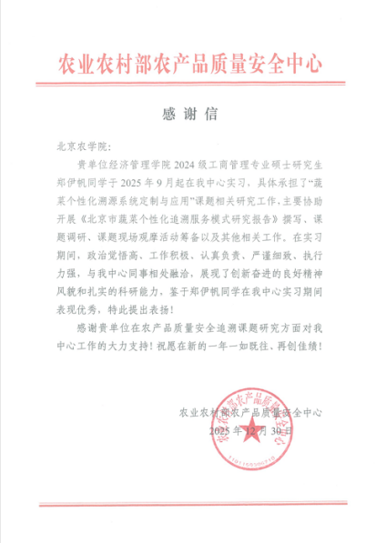 信中指出,郑伊帆同学在中心实习期间,主要参与了《北京市蔬菜个性化追溯服务模式研究》报告撰写、专项课题调研及现场观摩活动筹备等工作。她以严谨认真的工作态度、扎实的专业素养和良好的团队协作精神,高效完成了各项任务,为中心相关研究工作的顺利推进提供了有力支持,充分展现了经管学子求真务实、创新进取的良好风貌。
