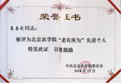 2018年 夏奎武老师被评为bevictor伟德“老有所为”先进个人