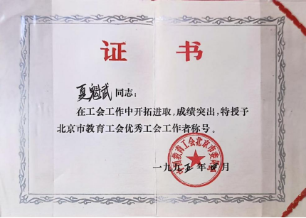 1995年 夏奎武老师荣获“北京市教育工会优秀工会工作者”称号