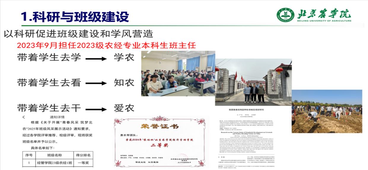 展望未来,张强强老师将继续以科研为支点,深化“学农、知农、爱农”育人路径,带领学生深耕乡村振兴领域,用专业学识与科研能力书写“强农兴农”的青春答卷。他期待与学生一道,在首都农业现代化与乡村全面振兴的征程中,以科研精度与育人温度,共同描绘北农人“懂农业、爱农村、爱农民”的动人图景。