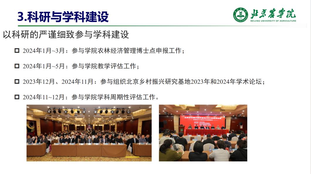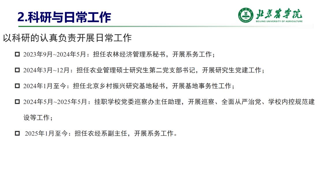 在农林经济管理系秘书、农业管理硕士研究生党支部书记、北京乡村振兴研究基地秘书等多岗位上,张强强老师始终以科研的精细与系统推进工作,将育人价值融入日常点滴。